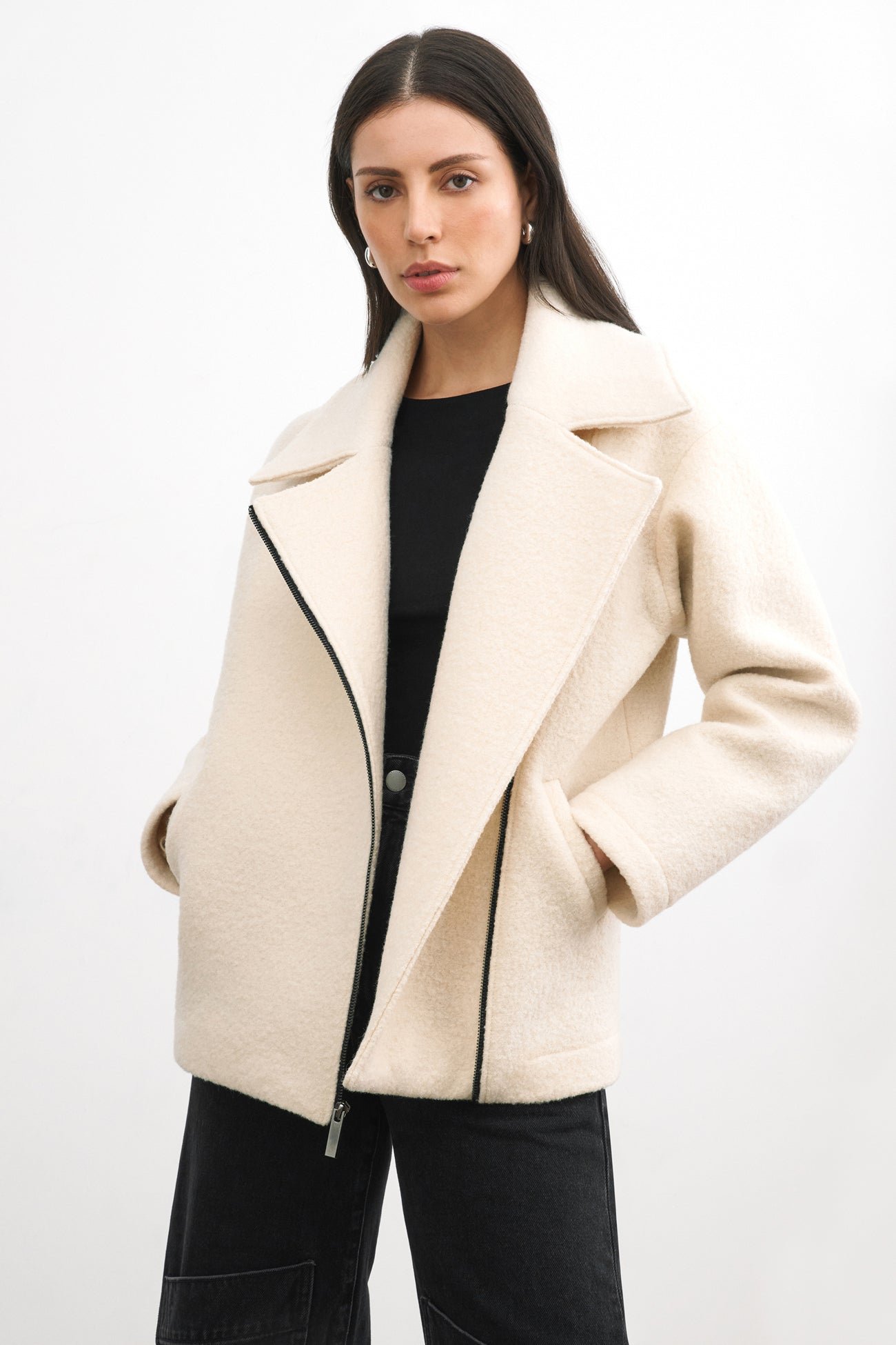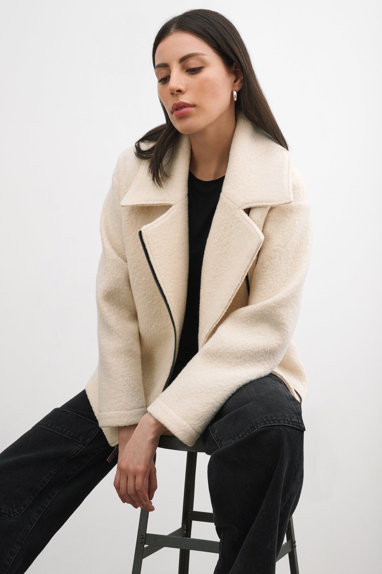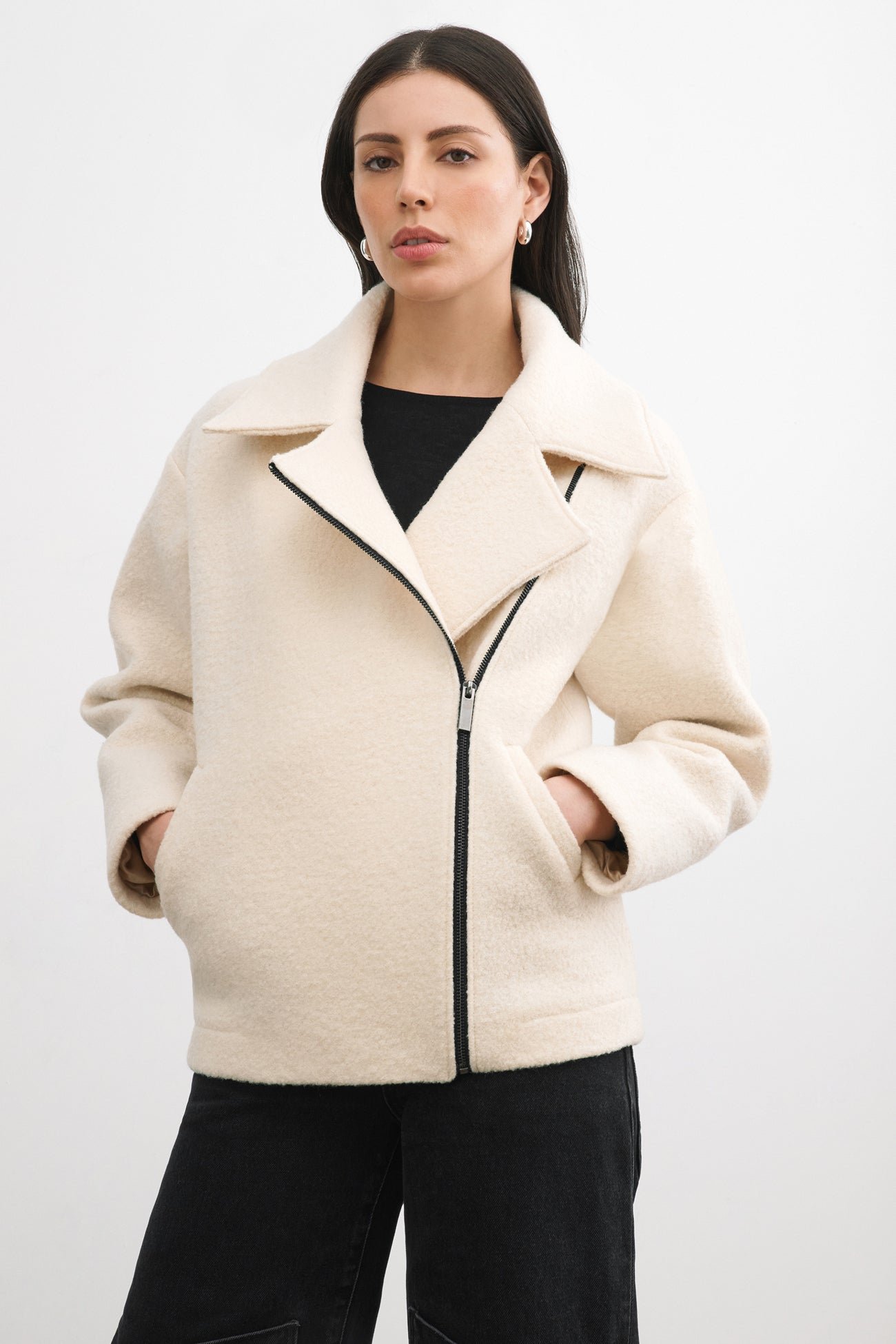 Reimagining the biker jacket silhouette in cozy 100% Italian virgin wool, our Harvey Jacket gracefully walks the line between elegance and edge. Fully lined for added warmth, Harvey adopts classic biker trademarks—like the off-center metal zipper, wide-notched lapels and pockets—and combines them with the luxe, tactile perfection of Italian wool. Styled for workdays, weekends or whenever, Harvey is a coat you can wear all fall and winter to elevate your cold-weather outfits. [SPLIT]