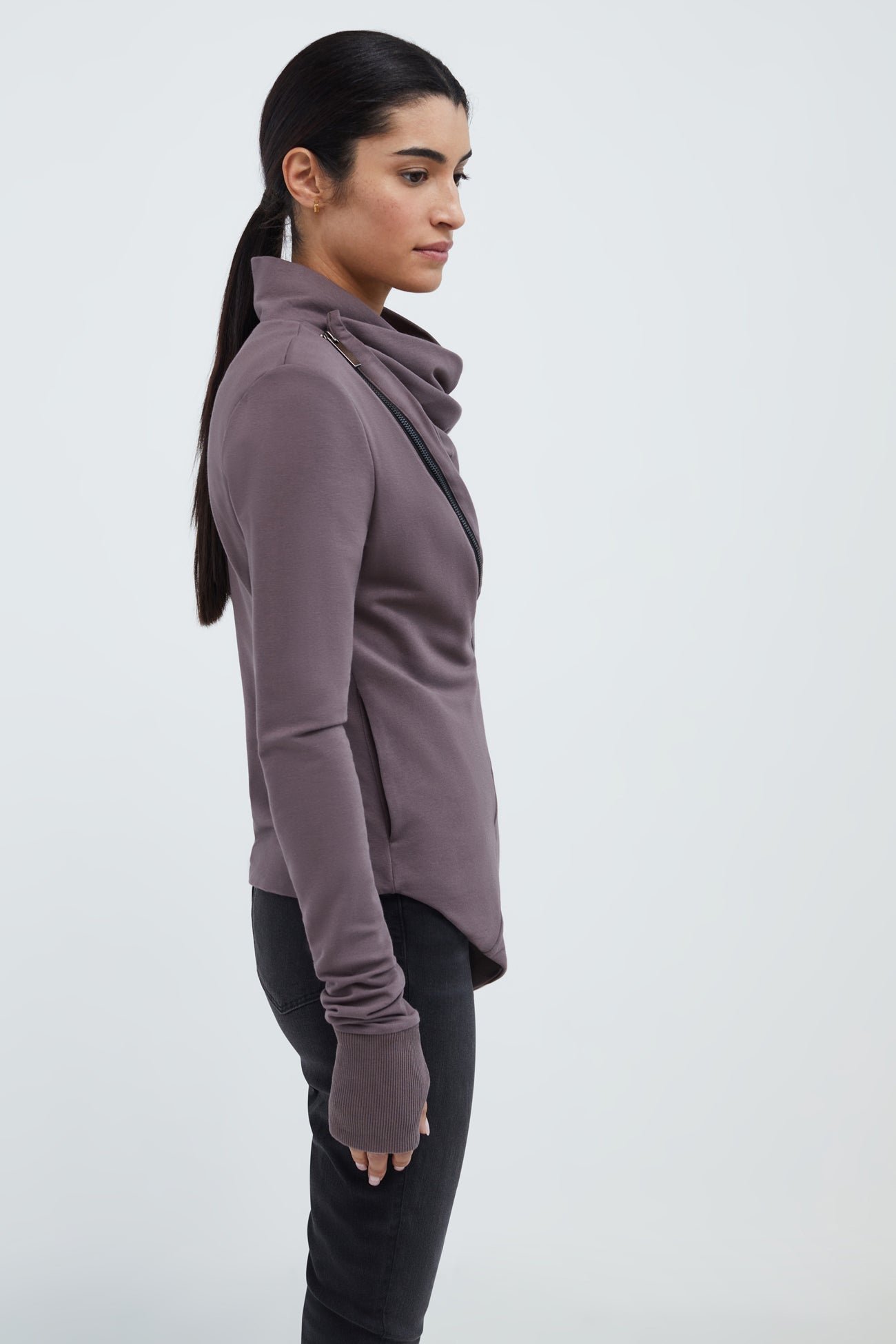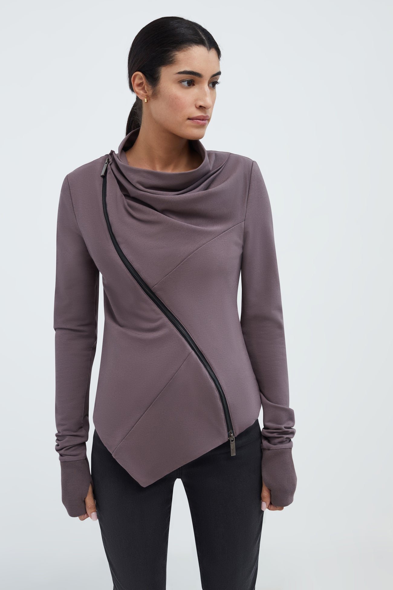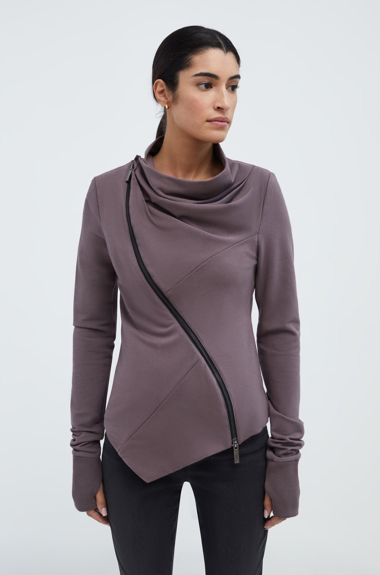 Add edge to your everyday with our Hoyt Jacket. Ideal for transitional weather, this lightweight European sweatshirt material piece is tailored with a cowl collar and a uniquely curved, two-way zipper, offering a waterfall drape when unzipped and a bold v-cut hem when closed. Hoyt offers a sleek fit, side pockets and extra long sleeves with thumbholes for a cozy, finishing touch.[SPLIT]