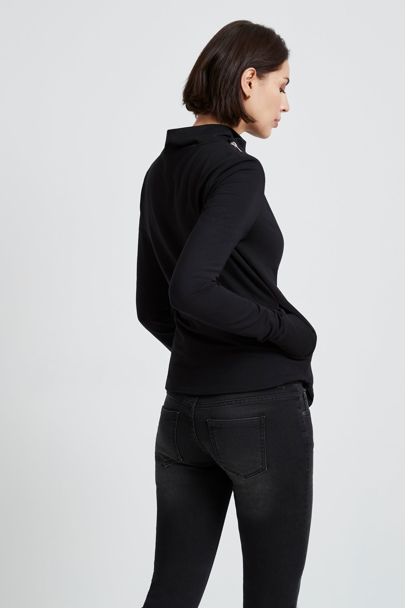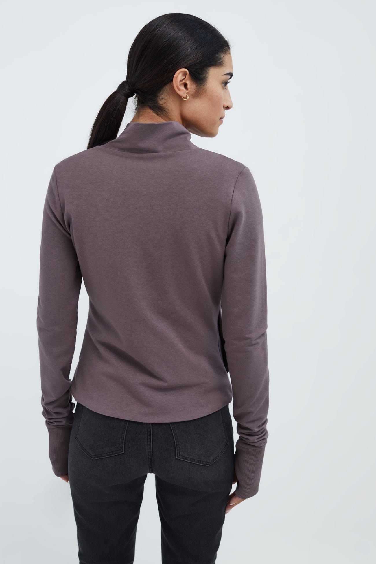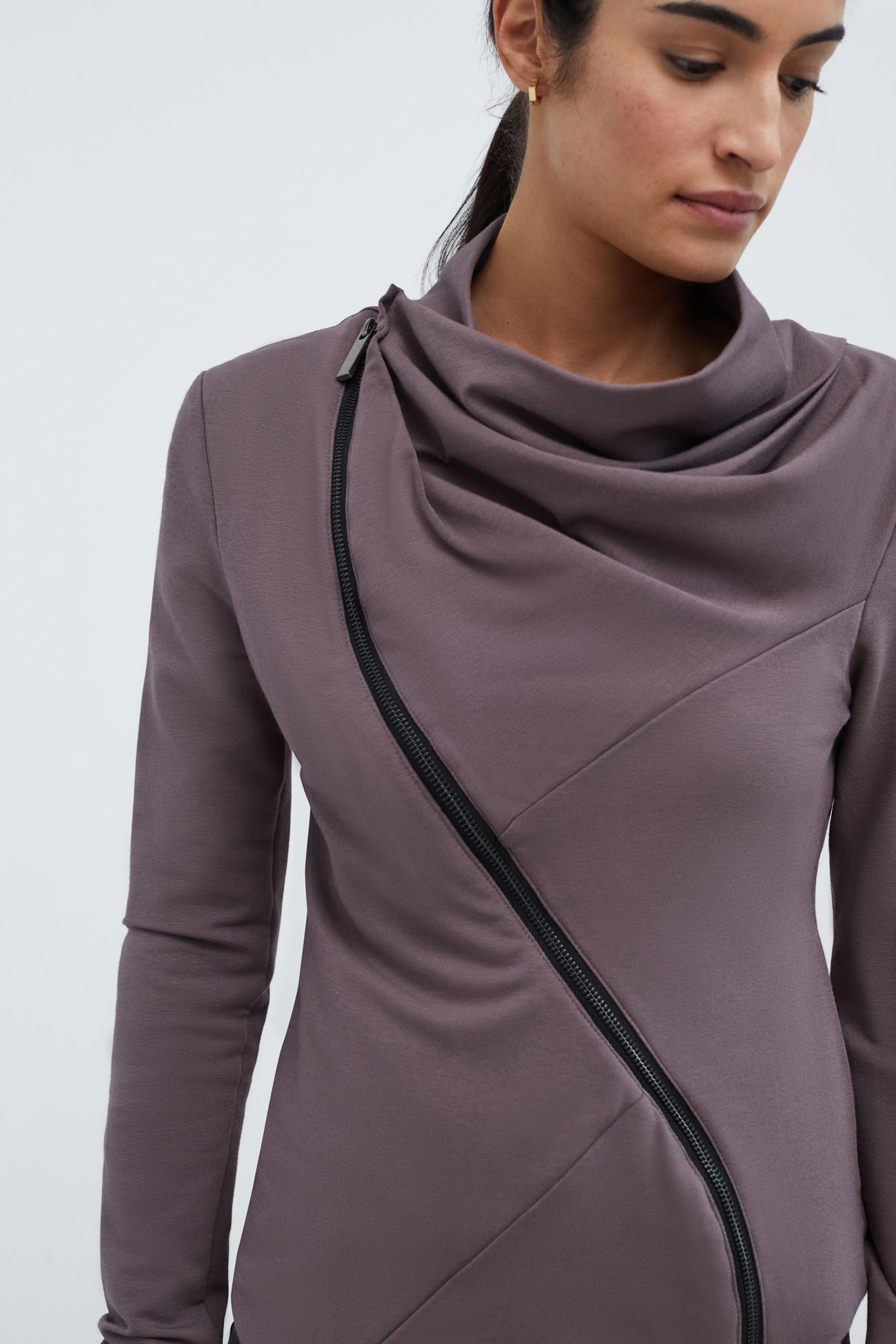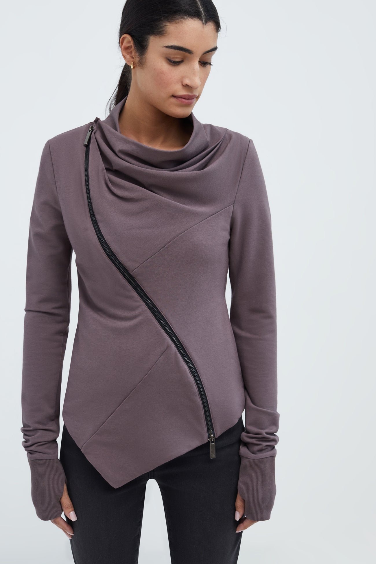 Add edge to your everyday with our Hoyt Jacket. Ideal for transitional weather, this lightweight European sweatshirt material piece is tailored with a cowl collar and a uniquely curved, two-way zipper, offering a waterfall drape when unzipped and a bold v-cut hem when closed. Hoyt offers a sleek fit, side pockets and extra long sleeves with thumbholes for a cozy, finishing touch.[SPLIT]