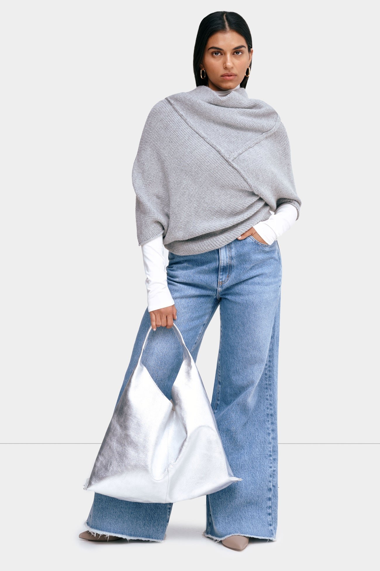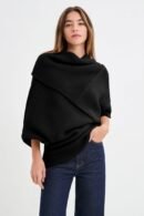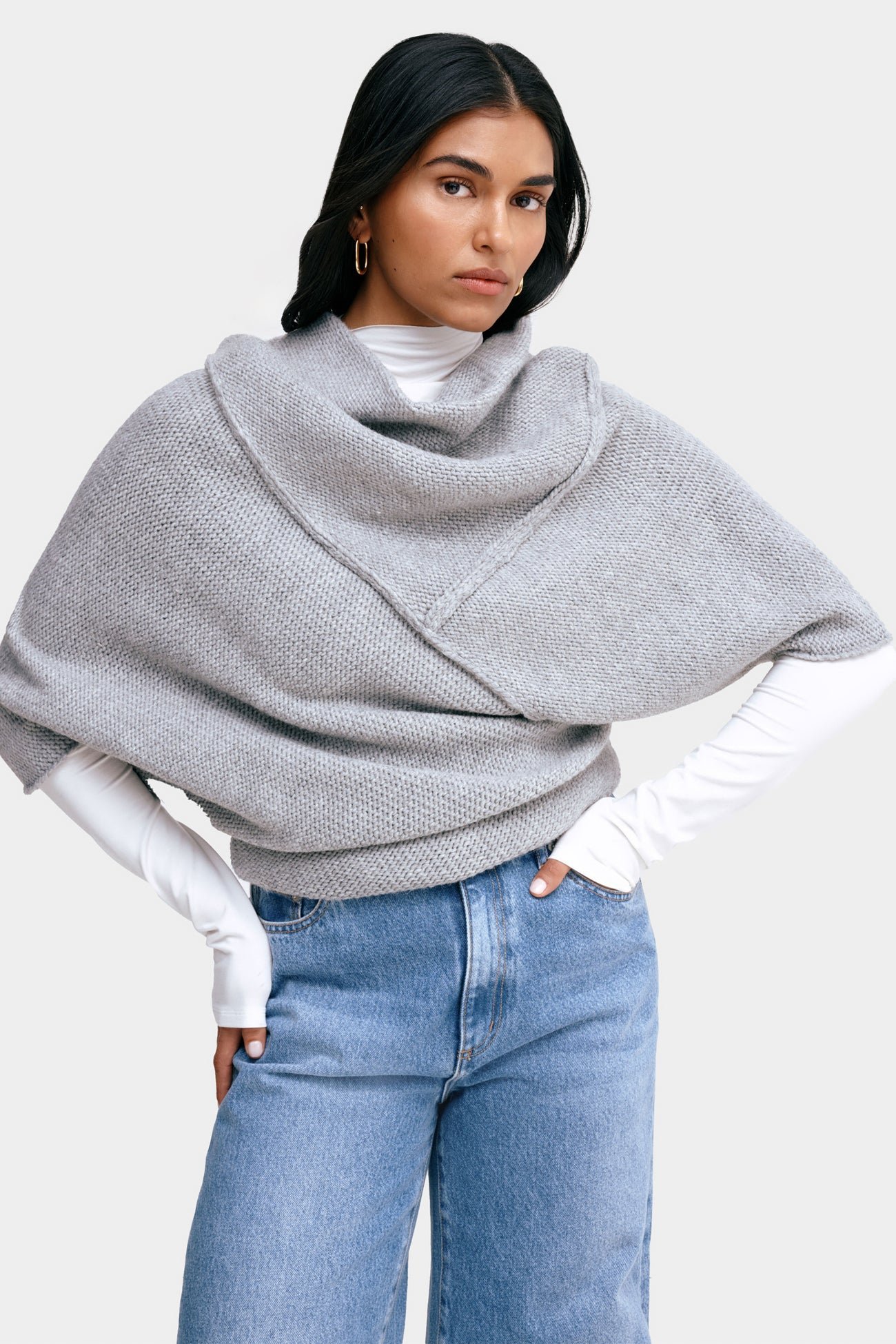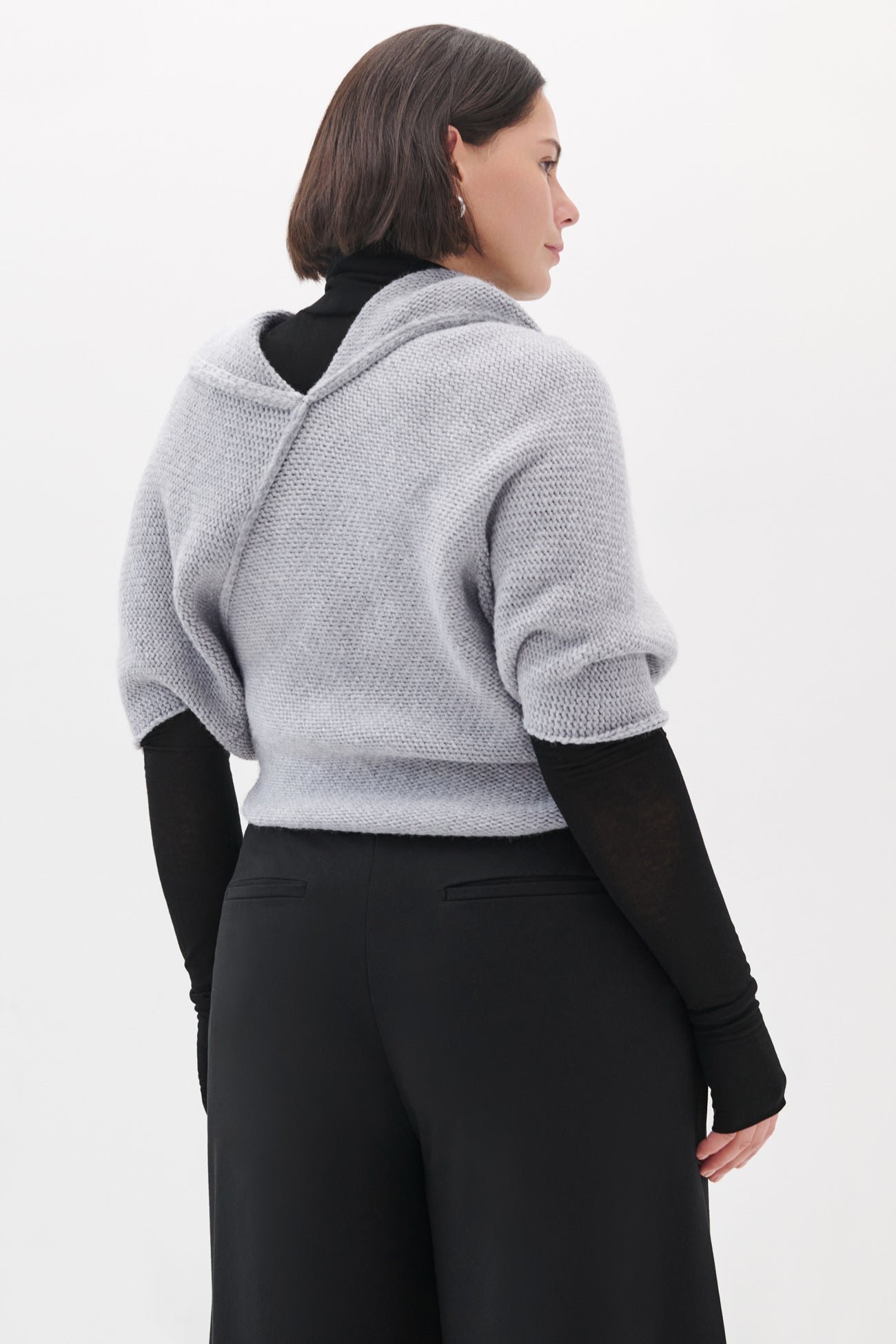 A cozy French wool-blend cover-up, our Palmer Knit Top features an asymmetric design with a high neckline at the front, and a v-neck at the back. Raised seam detailing creates geometric lines and adds visual interest to her divine knit texture. With a cropped length and half-length batwing sleeves, Palmer is designed to be layered over your go-to tops (we love it with the Sheer Addy). Perfect for shifting seasons.Â