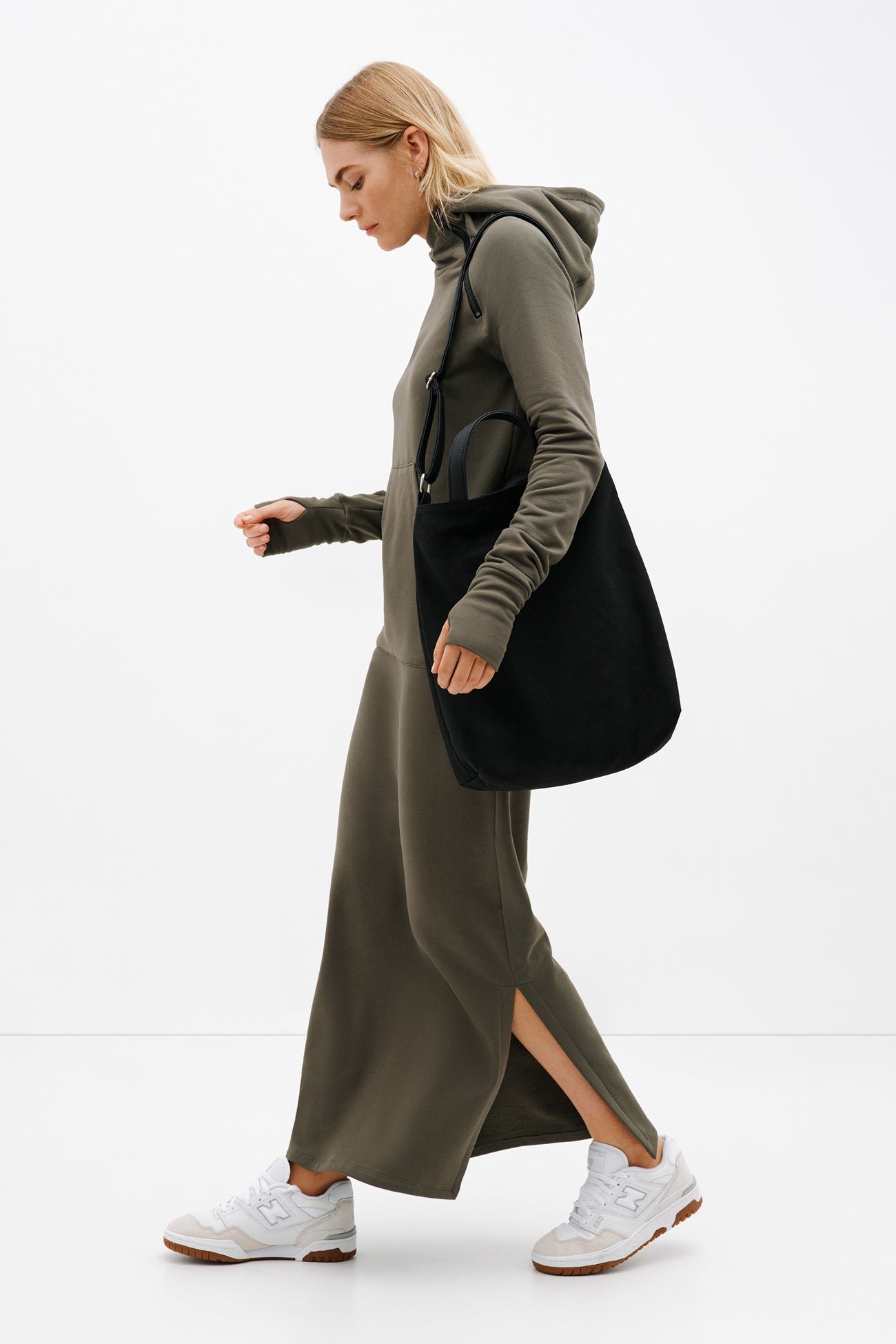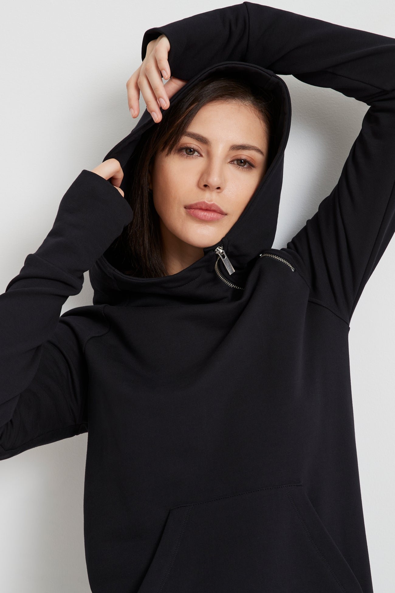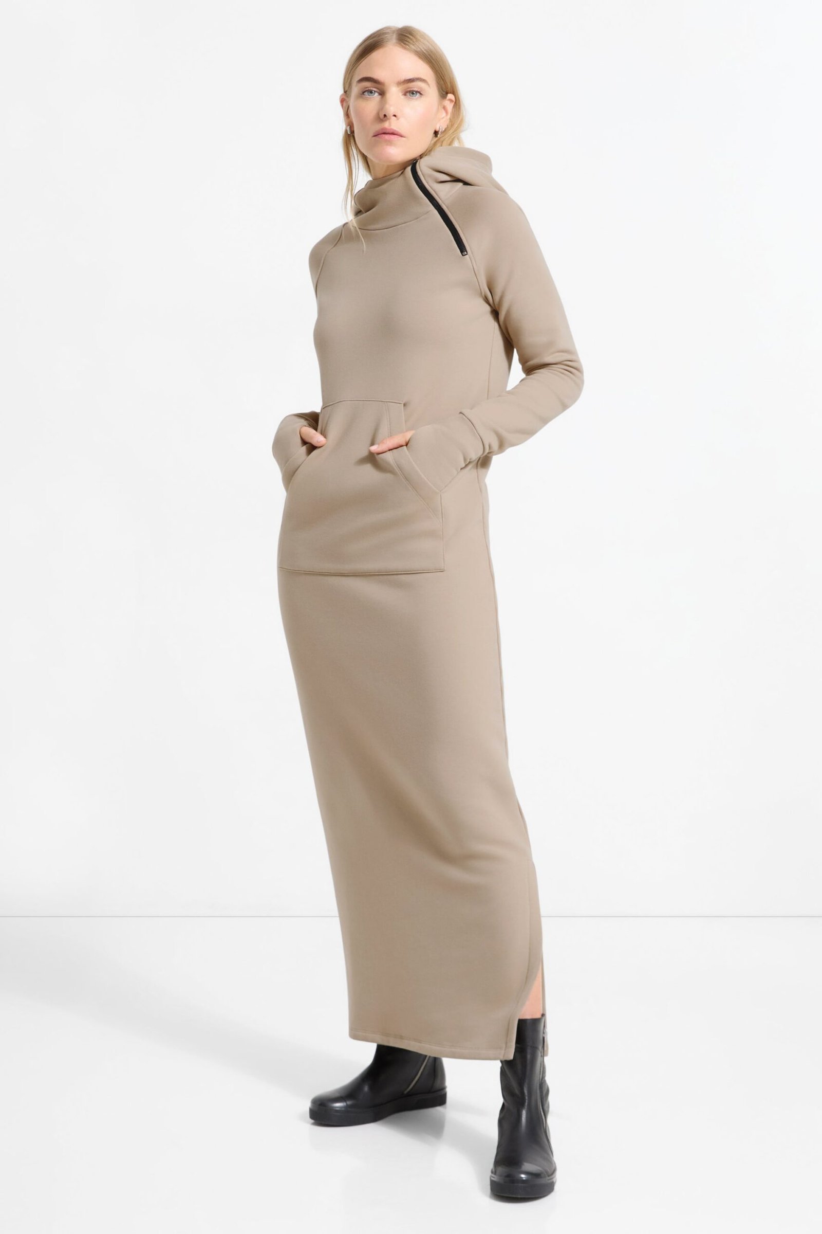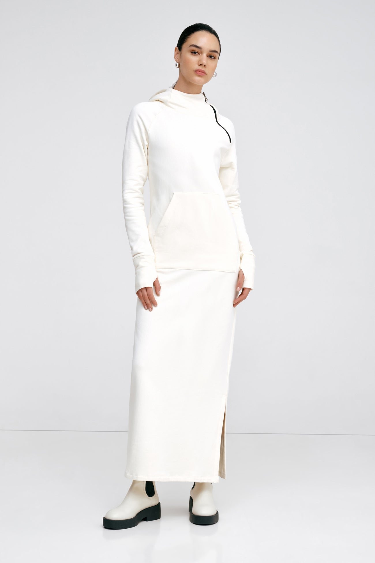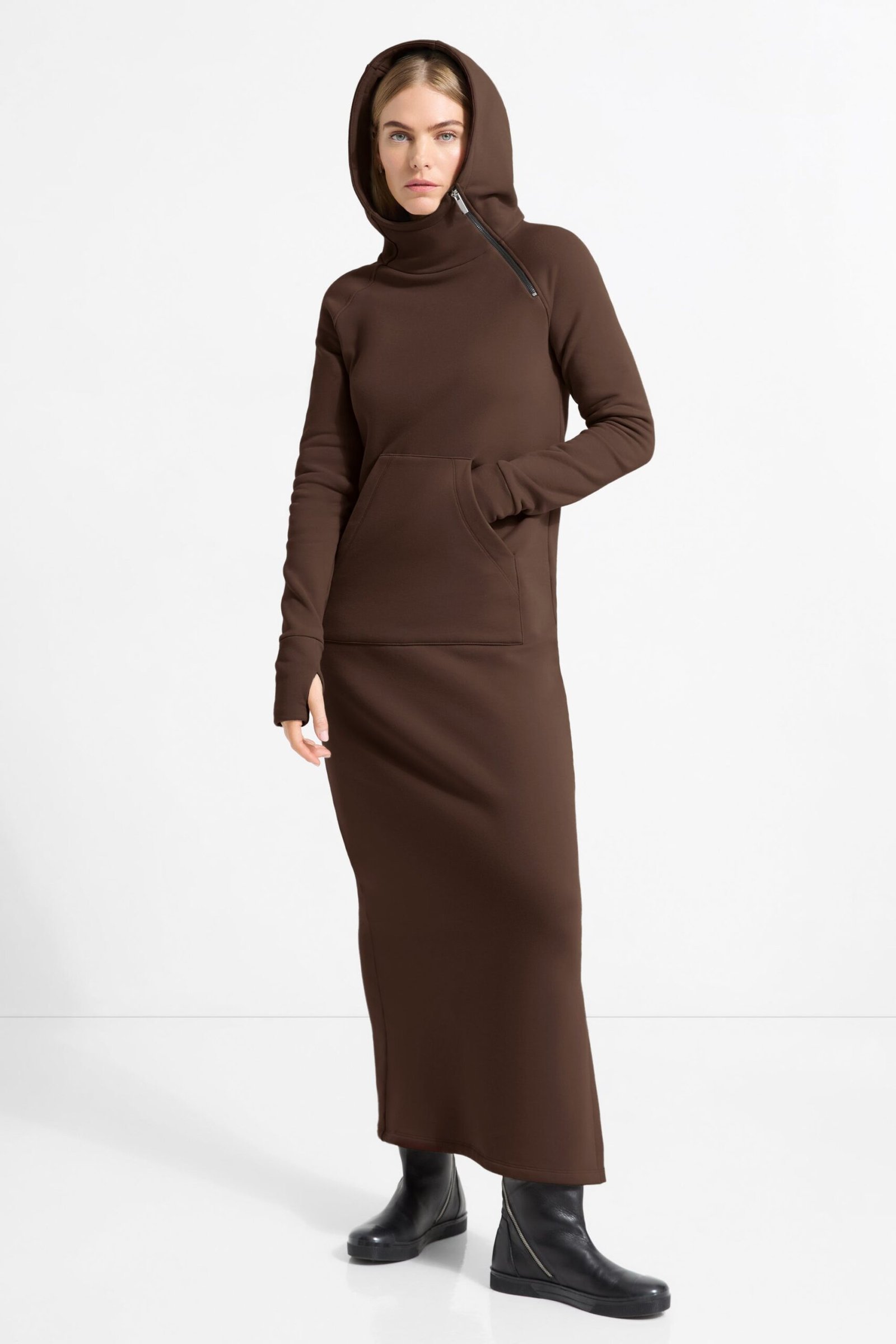 Our Tompkins Sweatshirt Dress is proof that maximum comfort can still catch the eye. Fashioned from our midweight, breathable European french terry, an ever-so-soft sweatshirt fabric, she features an oversized hood with an asymmetric zip for visual interest. Thumbholes at the sleeves and a front patch-pocket are there to warm your hands. Tompkins’ side hem is also detailed with a slit so you can show off your boots.